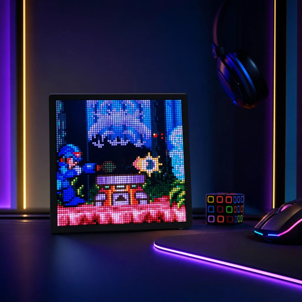 Das LED Pixel Art Display verwandelt jeden Schreibtisch in eine Galerie. Zeige Pixel-Art, GIF-Animationen, die Uhrzeit oder eigene Designs — alles in leuchtenden RGB-Farben auf einer kompakten LED-Matrix.